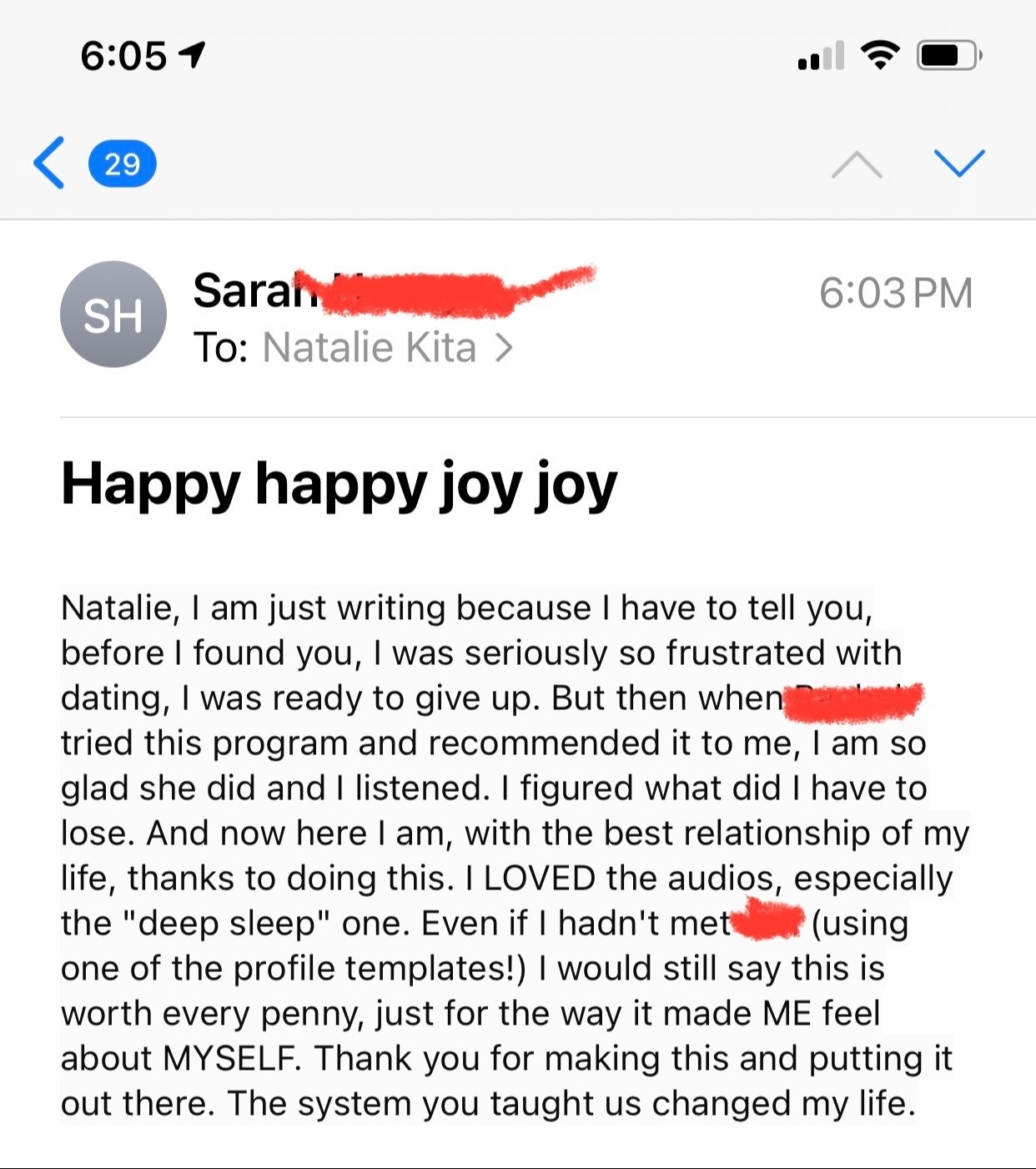 The most frustrating part is always seeming to attract the wrong guy and not knowing why. After working with natalie, my love life is quite amazing. It was something that I've worked on for a long time, and quite honestly, I thought I could probably have done this by myself. But since being in this program, I realized that I could not have done it by myself.