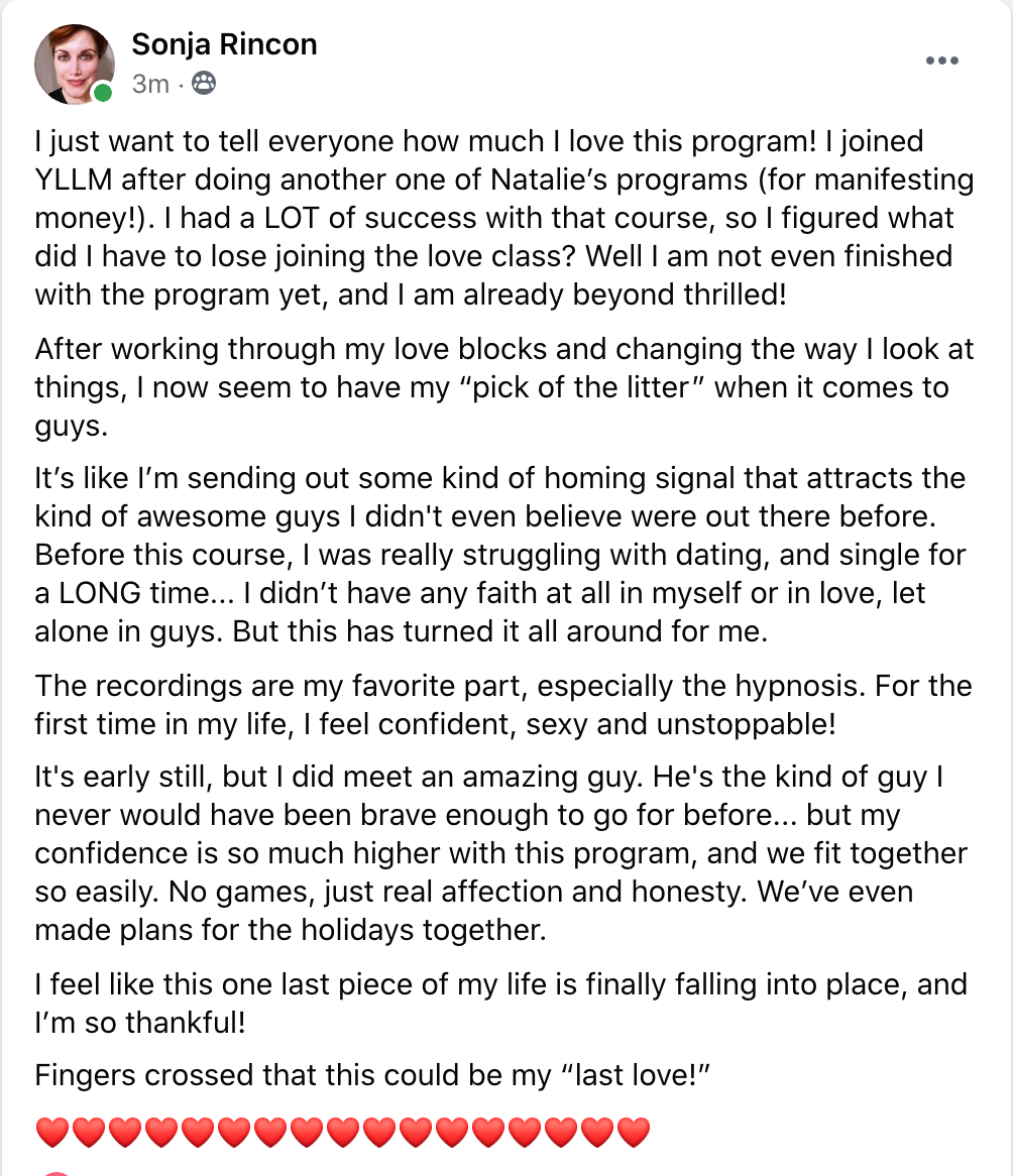 "Natalie and Your Last Love Method are, by far, the best program, and by far, the best coach I've ever had. And I was honestly hesitant at first because I've had some bad coaching in the past and I wasn't sure that I wanted to make the investment, but I can't even begin to tell you how much it has changed my life and it is worth a million times more.